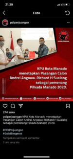 Dalam foto yang disertai logo PDI Perjuangan itu, tertulis kalimat: “KPU Manado menetapkan Pasangan Calon Andrei Angouw – Richard H. Sualang sebagai pemenang Pilkada Manado 2020″.