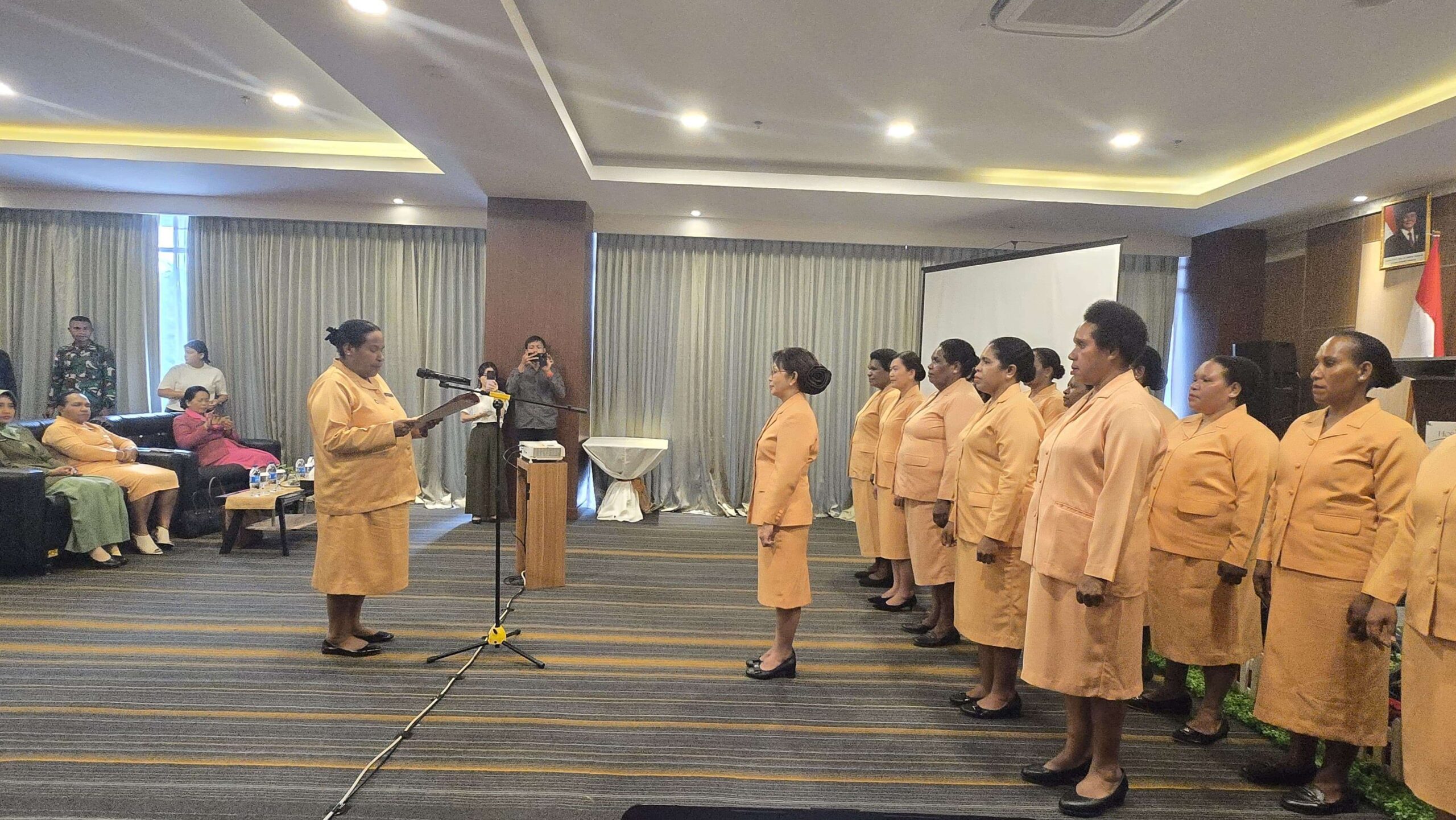 Ketua DWP Provinsi Papua Pegunungan Sisilia W. Siep saat mengukuhkan Ketua DWP Dina Tangapo bersama seluruh pengurus DWP Kabupaten Yahukimo.