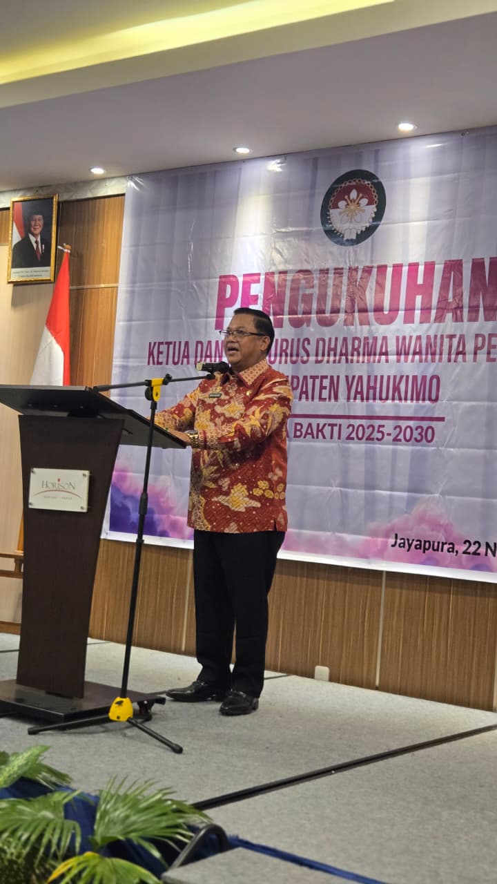 “Ada sejumlah tantangan ke depan yang dihadapi Kabupaten Yahukimo, antara lain tingkat pendidikan dan literasi yang masih rendah, persoalan kesehatan, tuntutan pelayanan ASN yang lebih humanis dan profesional, perubahan sosial yang menuntut ketahanan keluarga lebih kuat. Maka DWP memiliki peran penting sebagai pondasi pertama penguatan karakter dan kesejahteraan keluarga ASN. Pembangunan daerah sejatinya dimulai dari rumah tangga,” jelasnya.
