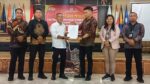 Foto: Ketua KPU Talaud Andri L. J. Sumolang didampingi empat komisioner lainnya saat menyerahkan keputusan KPU Talaud perihal penetapan DPS Pilkada 2024 kepada Kasubseksi Admisi Orientasi Lapas Lirung Marthen Permenas Bee pada rapat pleno rekapitulasi dan penetapan DPS di Aula KPU Talaud, Sabtu (10/08). (Rey/Jejak Publik.Com)