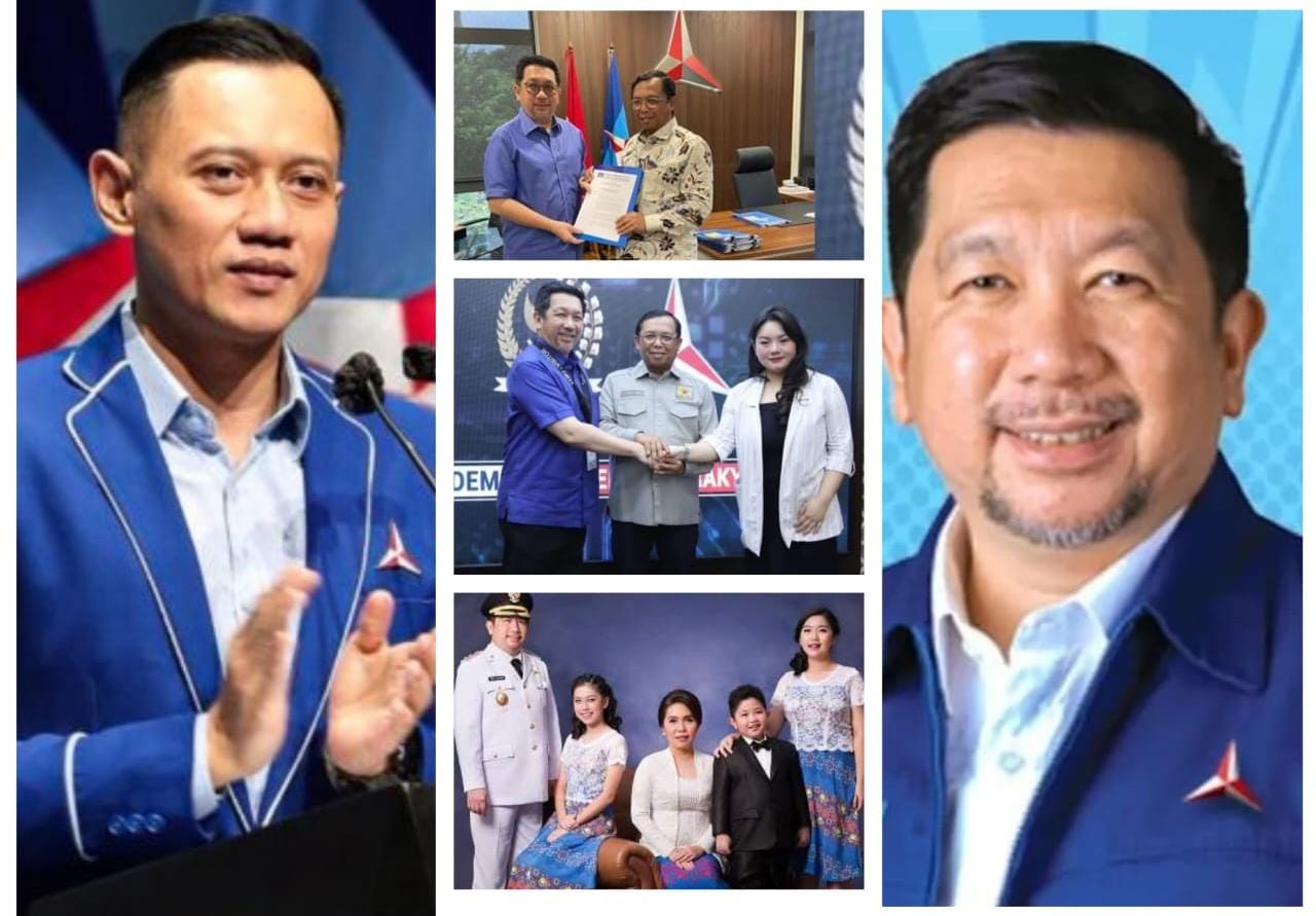 FOTO:(Kiri) Agus Harimurti Yudhoyono, (Kanan) Mor Dominus Bastiaan, (Tengah / Atas ke bawah) Mor Bastian menerima SK dari Sekjen Demokrat, berjabat tangan dengan Hillary Brigitta Lasut serta istri dan anal-anaknya.