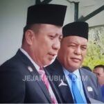 Penjabat Bupati Kepulauan Talaud Fransiscus Engelbert Manumpil (kiri) dan Ketua DPRD Talaud Engelbertus Tatibi (kanan) di teras Gedung Sidang DPRD Talaud, Sabtu (14/12/2024).