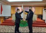 Sekjen PB FOBI, Xaverius Djunair menyerahkan pataka kepada Ketua Pengprov FOBI Sulut di Hotel Grand Puri, Manado.