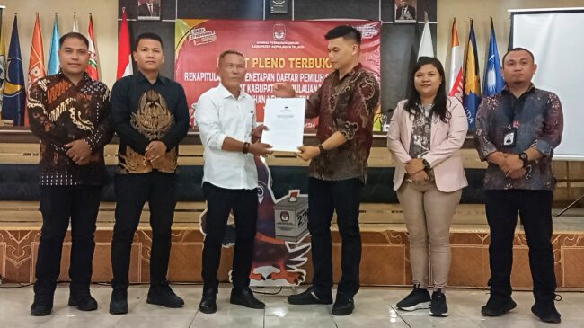 Foto: Ketua KPU Talaud Andri L. J. Sumolang didampingi empat komisioner lainnya saat menyerahkan keputusan…