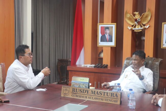 FOTO: General Manager PLN IUIW Suluttenggo J. A. Ari Dartomo berbincang-bincang dengan Gubernur Sulawesi Tengah,…