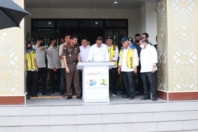 FOTO: Presiden Jokowi menandatangani prasasti Rusun Kejati Sulut di teras rusun di Manado. MANADO, JP…