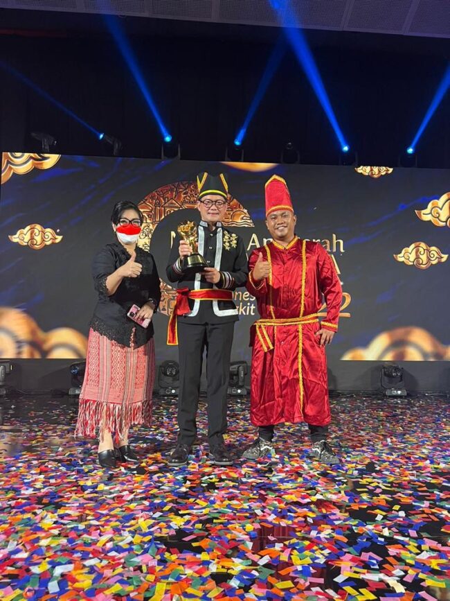 Foto: Bupati Minut Joune Ganda memegang piala foto bersama Kepala Dinas Pariwisata Minut Femmy Pangkerego….