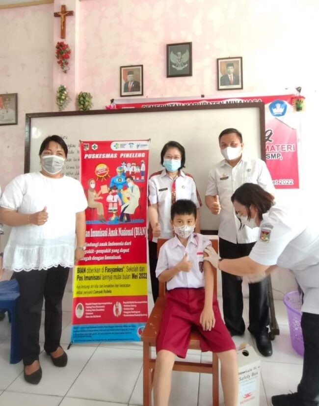 Salah satu siswa disuntik imunisiasi disaksikan Sekcam Audy Pungus, Kepala Puskesmas dr. Evi Kawihardja dan…