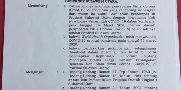 MANADO, JP- Gubernur Sulawesi Utara (Sulut) Olly Dondokambey SE menetapkan Status Siaga Darurat Penanganan Virus…