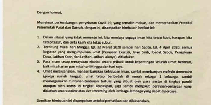 Surat Himbauan Uskup Manado Cegah Penyebaran Virus Korona
