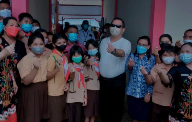 Bupati Elly Lasut bersama anak-anak dan para guru pada pembukaan vaksinasi anak usia 6-12 tahun…