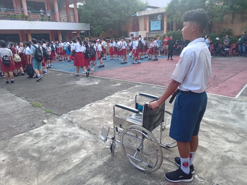 Yang menarik juga, di sela-sela upacara berlangsung, salah seorang siswa SMP Frater Don Bosco Manado terlihat memegang sebuah kursi roda tepat di bagian belakang barisan para calon siswa baru.