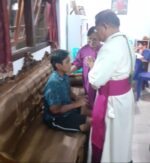 Uskup Manado Benedictus Estephanus Rolly Untu MSC mendoakan Jeremi Hutagalung yang didampingi Ibunda Gbl Lyan Vera Hutagalung Sihotang MTh selaku Ketua PMS KGPM Sentrum Kawangkoan.