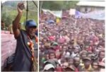 (Kiri) Tangkapan layar Bupati Yahukimo, Provinsi Papua Abock Busup membawa tumpukan uang dana desa ke tengah lapangan untuk diperlihatkan ke masyarakat. (Kanan) Tampak begitu banyak warga yang berkumpul di lapangan terbuka. (Screenshot video viral)
