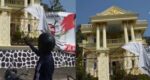 Dengan perpaduan warna krem dan emas menjadikan rumah ini sangat mentereng dan mencolok. Pagar depan rumah dipasang menjulang tinggi dengan beberapa ornamen menghiasi setiap sudutnya.