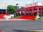 Tema perayaan HUT ke-77 Kemerdekaan RI “Pulih Lebih Cepat, Bangkit lebih Kuat” nampak terpampang di sekitar lapangan upacara.
