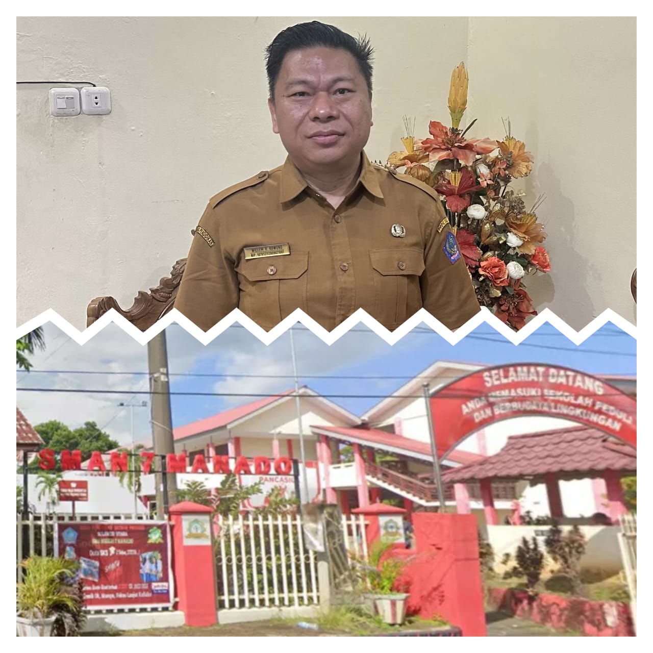 (Atas) Kepsek Dr. William Hanny Rawung SS., M.Hum. (Bawah) Gedung SMAN 7 Manado.
