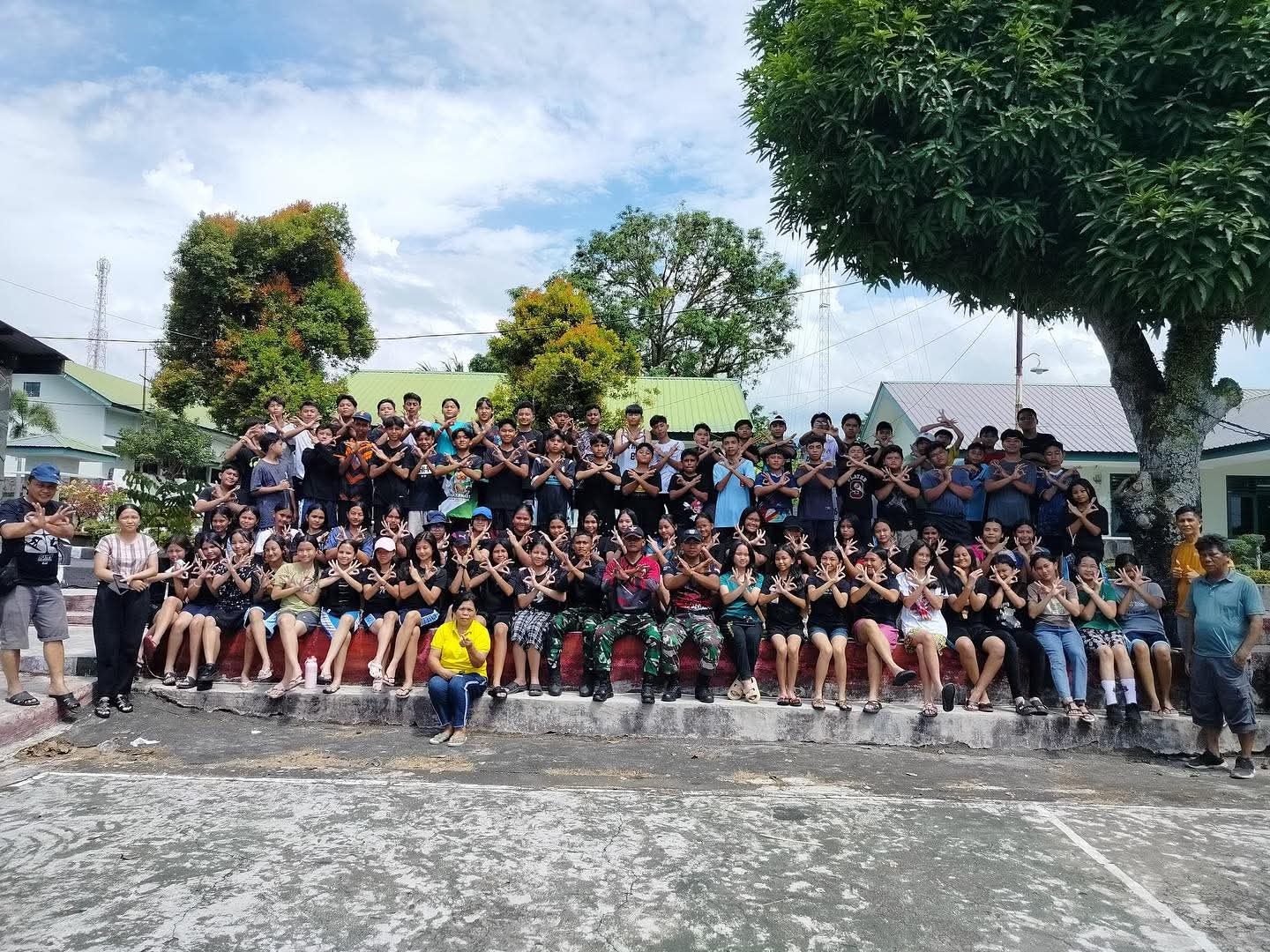 Para siswa dan guru serta pihak Asmil Kompi Senapan A. Yonif Raider 712 – Tateli foto bersama.