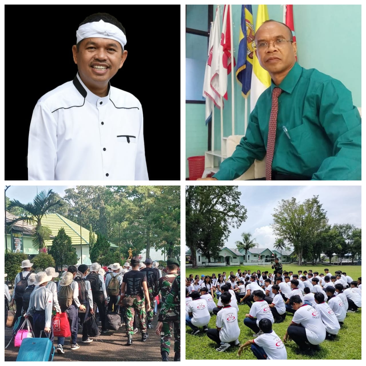 FOTO: (Kiri atas ke bawah) Gubernur Deddy Mulyadi dan para pelajar SMA di Jawa Barat yang dikirim Deddy Mulyadi ke barak militer. (Kanan atas ke bawah) Kepala Sekolah Frater Julius Sole dan siswa pengurus OSIS SMP Frater Don Bosco Manado saat digembleng di Asmil Kompi Senapan A. Yonif Raider 712 – Tateli.